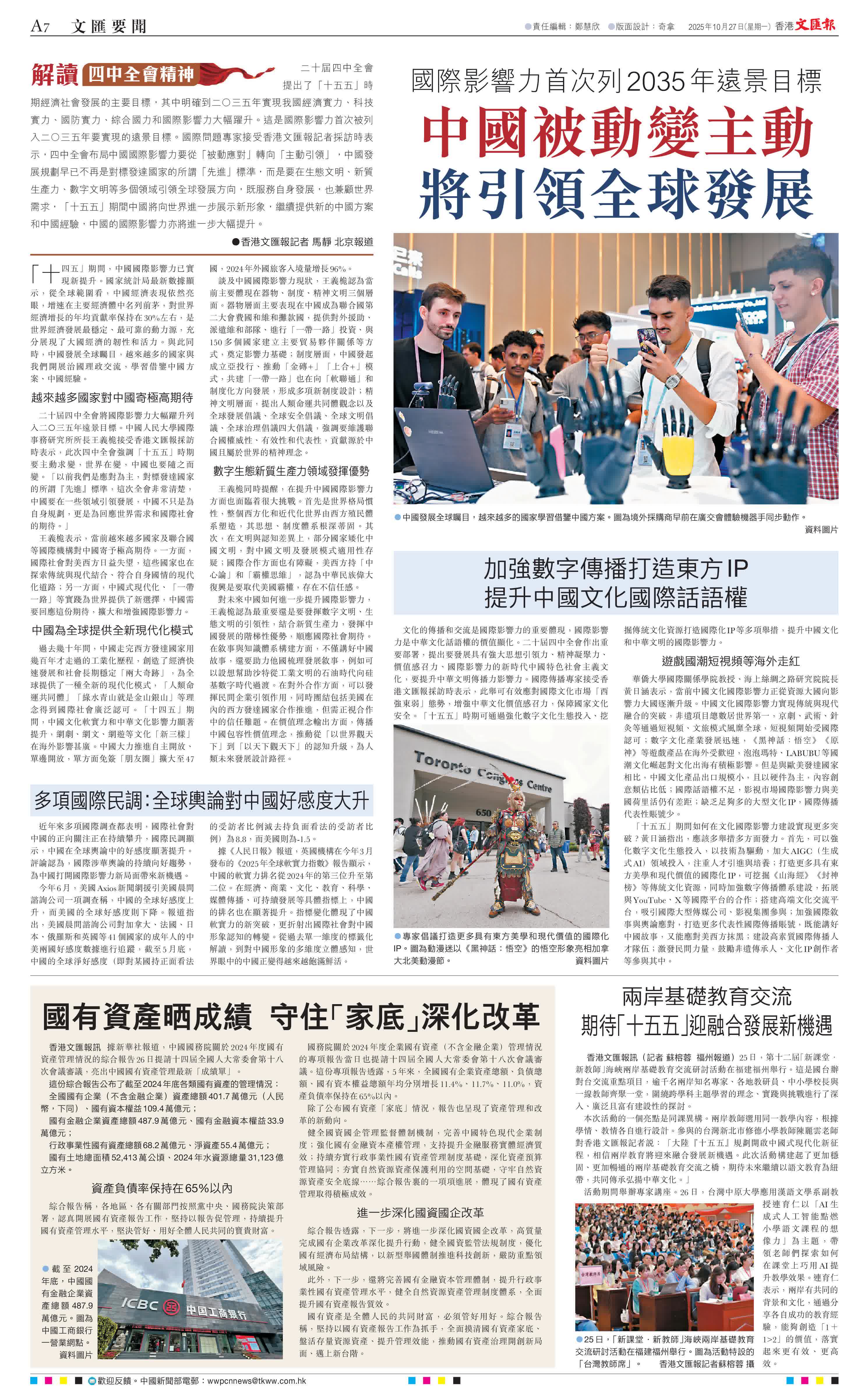 (香港文匯報(bào)記者馬靜 北京報(bào)道)二十屆四中全會(huì)提出了「十五五」時(shí)期經(jīng)濟(jì)社會(huì)發(fā)展的主要目標(biāo),其中明確到二〇三五年實(shí)現(xiàn)我國(guó)經(jīng)濟(jì)實(shí)力、科技實(shí)力、國(guó)防實(shí)力、綜合國(guó)力和國(guó)際影響力大幅躍升。這是國(guó)際影響力首次被列入二〇三五年要實(shí)現(xiàn)的遠(yuǎn)景目標(biāo)。國(guó)際問(wèn)題專(zhuān)家接受香港文匯報(bào)記者採(cǎi)訪時(shí)表示,四中全會(huì)布局中國(guó)國(guó)際影響力要從「被動(dòng)應(yīng)對(duì)」轉(zhuǎn)向「主動(dòng)引領(lǐng)」,中國(guó)發(fā)展規(guī)劃早已不再是對(duì)標(biāo)發(fā)達(dá)國(guó)家的所謂「先進(jìn)」標(biāo)準(zhǔn),而是要在生態(tài)文明、新質(zhì)生產(chǎn)力、數(shù)字文明等多個(gè)領(lǐng)域引領(lǐng)全球發(fā)展方向,既服務(wù)自身發(fā)展,也兼顧世界需求,「十五五」期間中國(guó)將向世界進(jìn)一步展示新形象,繼續(xù)提供新的中國(guó)方案和中國(guó)經(jīng)驗(yàn),中國(guó)的國(guó)際影響力亦將進(jìn)一步大幅提升。