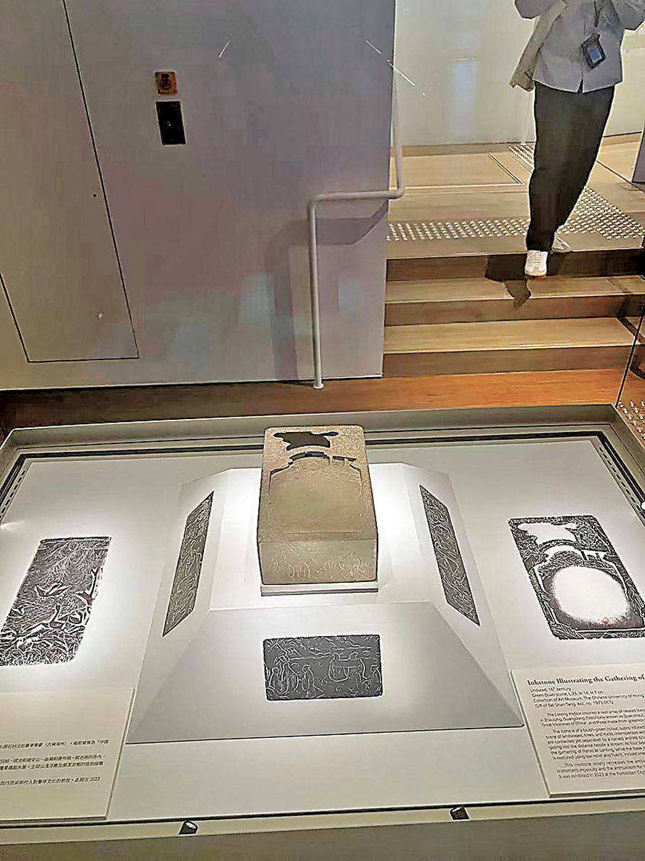 《蘭亭序》衍生了大量與文人相關(guān)的文物。此硯石材出自廣東肇慶。端硯被推為「中國四大名硯」之首,其中綠端較為罕見。此硯石色青綠,微帶土黃。硯緣環(huán)刻山水樹石連回紋,硯池和硯堂以一曲橋相連作隔。硯池側(cè)的亭內(nèi),有文士臨流遠(yuǎn)眺。硯之四側(cè)刻通景《蘭亭圖》,硯底雕群鵝戲水圖。全硯以淺浮雕及簡漯流暢的陰刻線琢而成,布局緊湊,內(nèi)容豐富。此硯生動再現(xiàn)了蘭亭雅集的意境,充分展現(xiàn)了工匠的巧思與明代人對亭文化的熱忱。