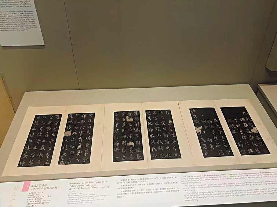 此為歐陽詢楷書,魏徵撰文。魏氏讚揚唐太宗平定天下,於九成宮發(fā)現(xiàn)醴泉,是為祥瑞,並勸諫他居高思墜。此碑是歐陽詢代表作,用筆精煉,氣象莊嚴(yán),元趙孟頫、清成親王永瑆等歷代名家推為楷書典範(fàn)。此本墨色濃厚古樸,先後由徽州鹽商汪廷璋及廣東藏家羅原覺等收藏。