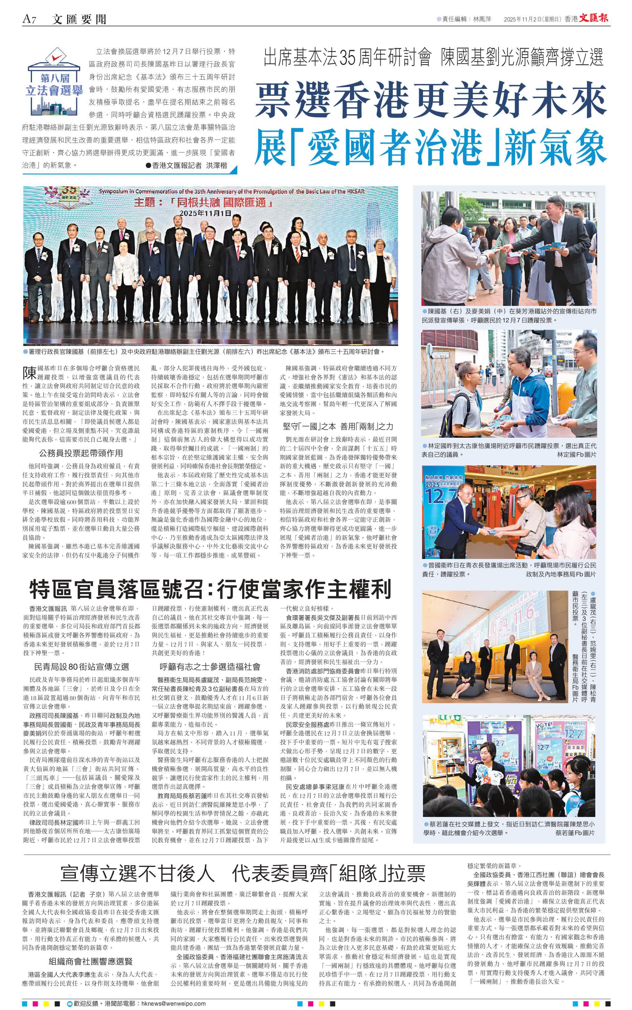 香港文匯報訊(記者 洪澤楷)立法會換屆選舉將於12月7日舉行投票,特區(qū)政府政務司司長陳國基昨日以署理行政長官身份出席紀念《基本法》頒布三十五周年研討會時,鼓勵所有愛國愛港、有志服務市民的朋友積極爭取提名,盡早在提名期結束之前報名參選,同時呼籲合資格選民踴躍投票。中央政府駐港聯(lián)絡辦副主任劉光源致辭時表示,第八屆立法會是事關特區(qū)治理經(jīng)濟發(fā)展和民生改善的重要選舉,相信特區(qū)政府和社會各界一定能守正創(chuàng)新,齊心協(xié)力將選舉辦得更成功更圓滿,進一步展現(xiàn)「愛國者治港」的新氣象。