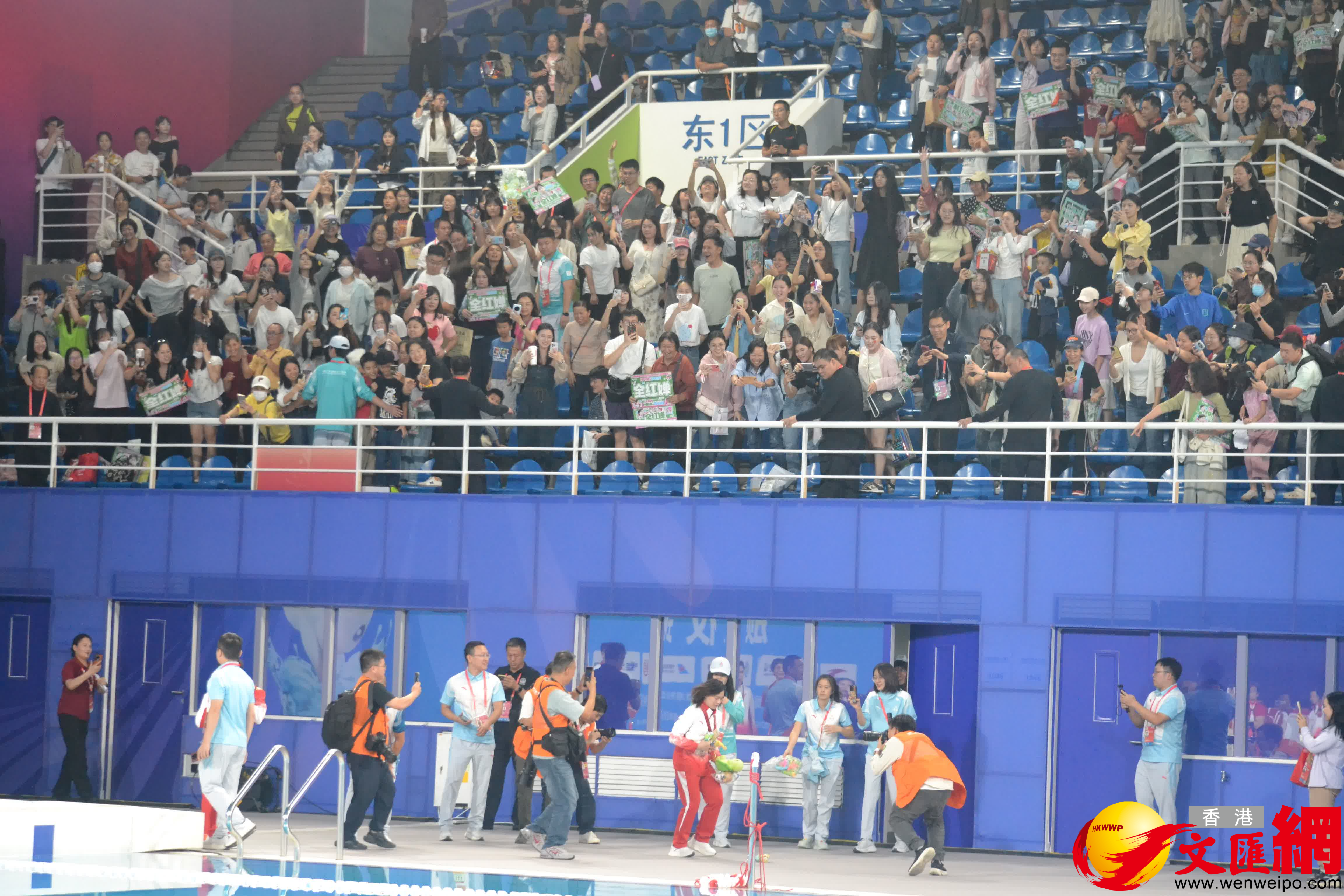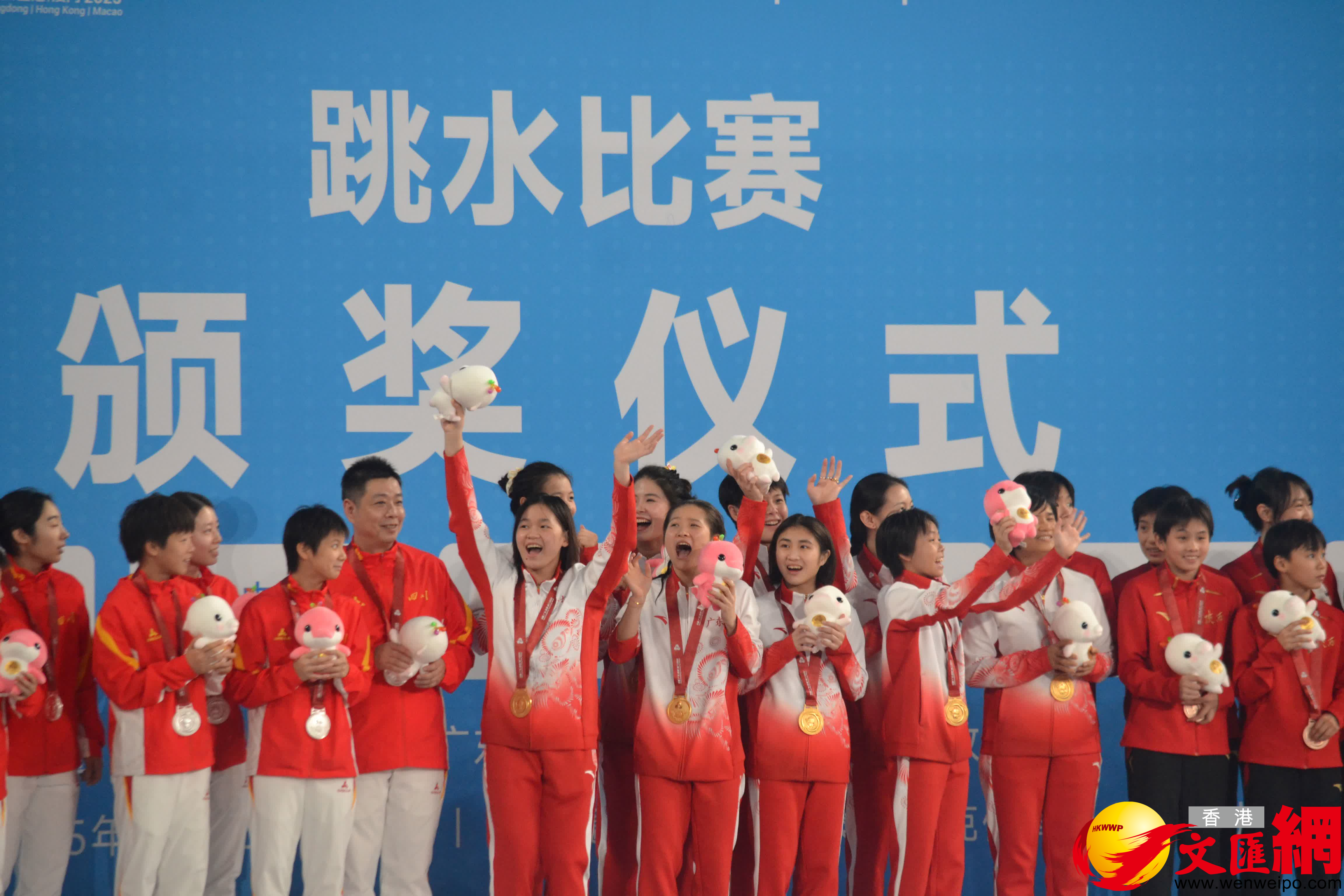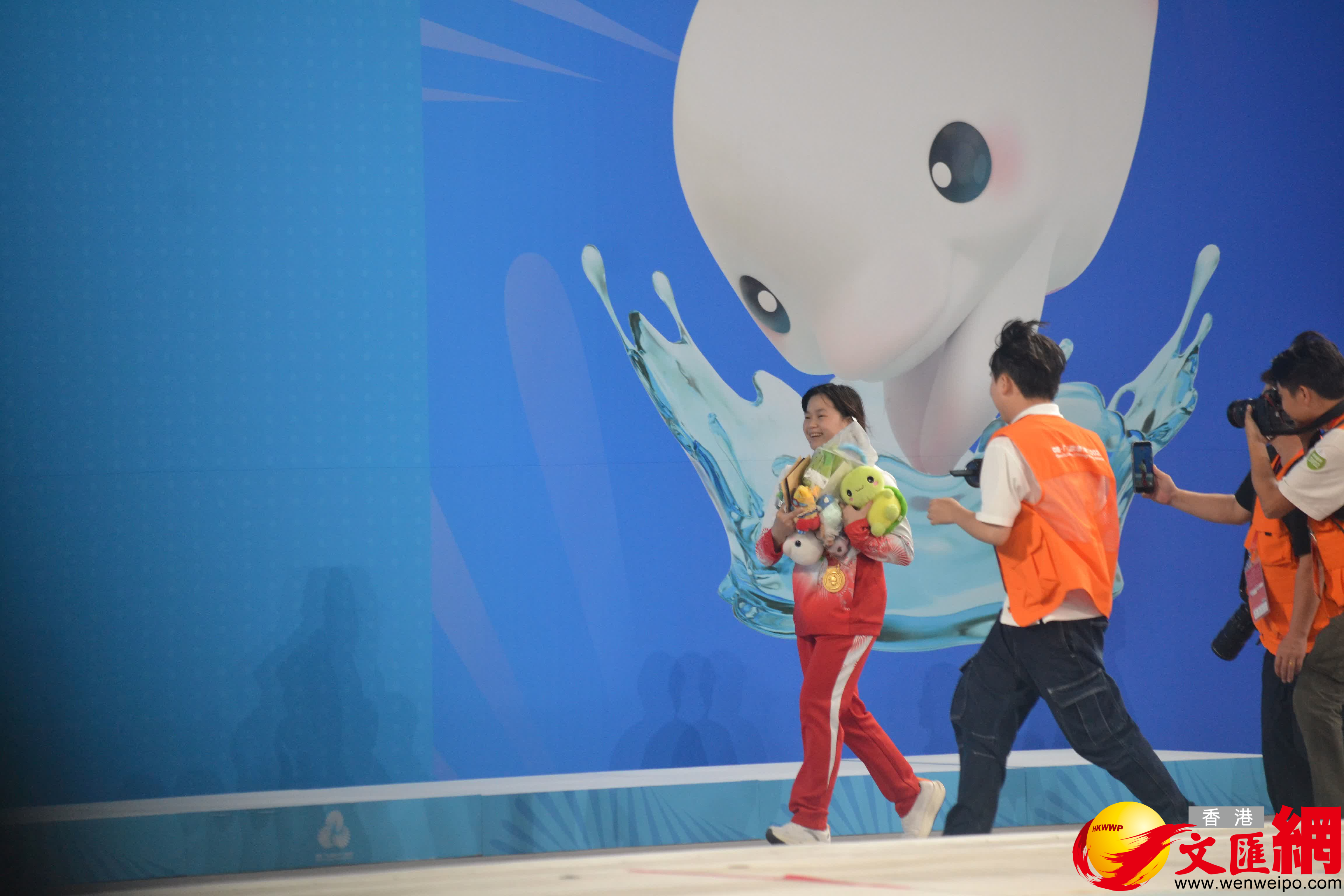 (香港文匯網(wǎng)記者 敖敏輝 廣州報(bào)道)2日,備受關(guān)注的十五運(yùn)會(huì)跳水女子團(tuán)體賽雙人10米跳臺(tái)比賽中,時(shí)隔6個(gè)月復(fù)出的全紅嬋和隊(duì)友表現(xiàn)搶眼,奪得組別榜首同時(shí),幫助廣東隊(duì)奪得十五運(yùn)會(huì)跳水項(xiàng)目首金,實(shí)現(xiàn)女團(tuán)項(xiàng)目衛(wèi)冕。在頒獎(jiǎng)禮上,全紅嬋心情大好,不斷與觀眾致意,頒獎(jiǎng)禮後更跑到觀眾區(qū)下方,與粉絲互動(dòng),並接住大家拋下來的玩偶和布娃娃。