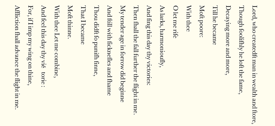 這是赫伯特一首「圖案詩」或「形體詩」('pattern' or 'shape' poem)《復活節(jié)翅膀》(Easter Wings)的展示。這類詩歌不僅供人閱讀,更注重其形態(tài)的鑑賞。此詩最初被橫向印製在書籍相對的兩頁上,詩行排列(如上所示)如展翅高飛的鳥兒向上翱翔。