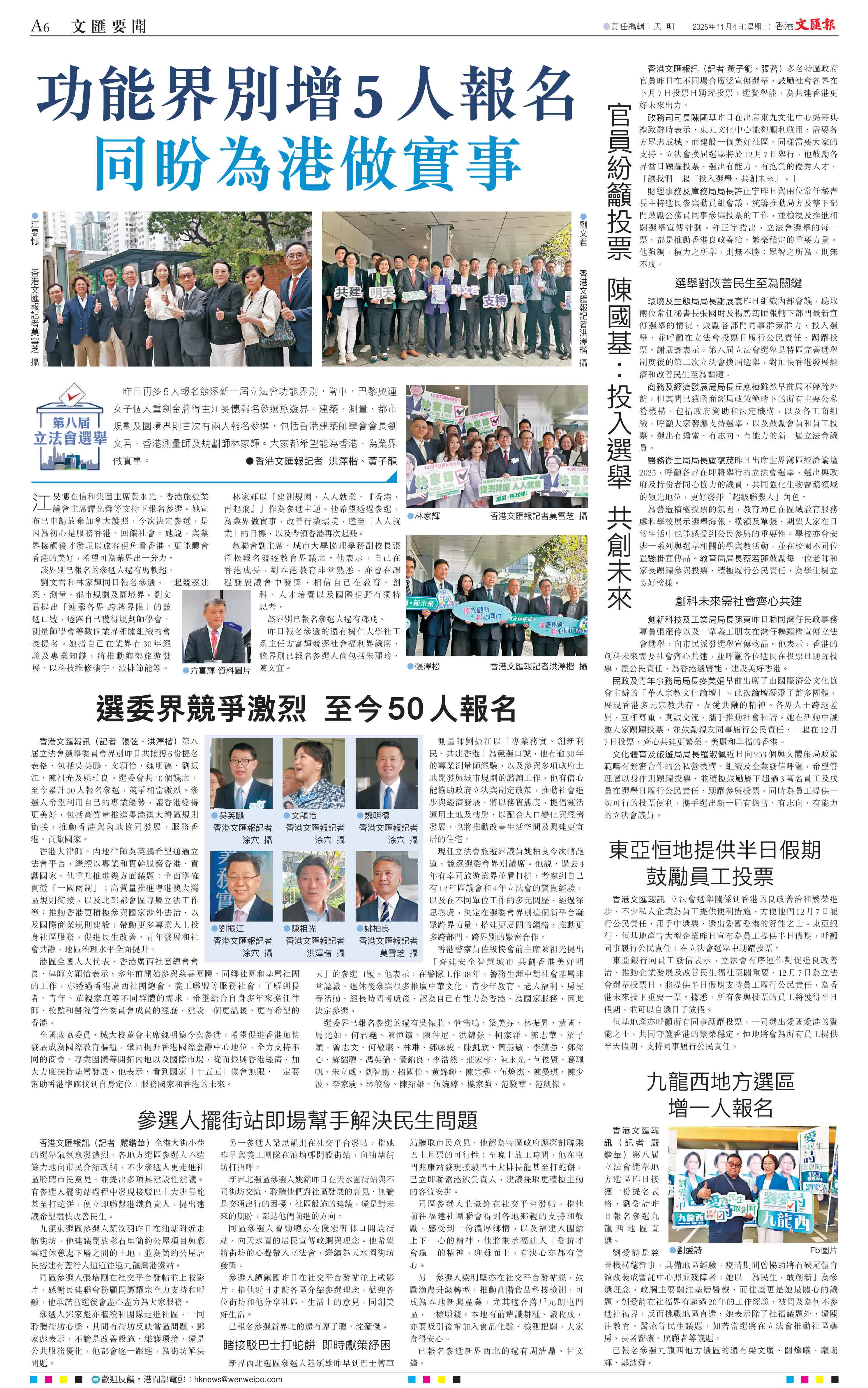 香港文匯報訊(記者 張弦、洪澤楷)第八屆立法會選舉委員會界別昨日共接獲6份提名表格,包括吳英鵬、文頴怡、魏明德、劉振江、陳祖光及姚柏良。選委會共40個議席,至今累計50人報名參選,競爭相當(dāng)激烈。參選人希望利用自己的專業(yè)優(yōu)勢,讓香港變得更美好,包括高質(zhì)量推進(jìn)粵港澳大灣區(qū)規(guī)則銜接,推動香港與內(nèi)地協(xié)同發(fā)展,服務(wù)香港、貢獻(xiàn)國家。