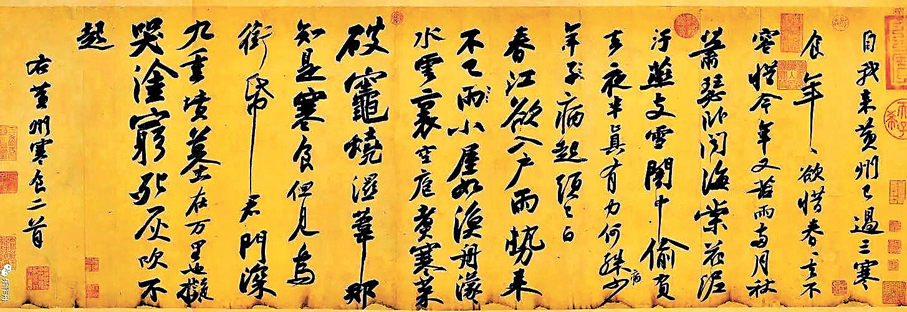 然而書道的至境,終在剛?cè)嵯酀?jì)處。智永和尚的千字文,鐵線為骨,銀絲為絡(luò),恰似高僧說(shuō)法——戒律清規(guī)是鐵,慈悲智慧是銀。最喜歡蘇東坡的《寒食帖》,「破灶燒濕葦」如鐵畫裂帛,「哭途窮」3字卻化作銀淚縱橫。這哪裏是在寫字?分明是將生命的苦澀與曠達(dá),一併揉進(jìn)筆墨裏了。