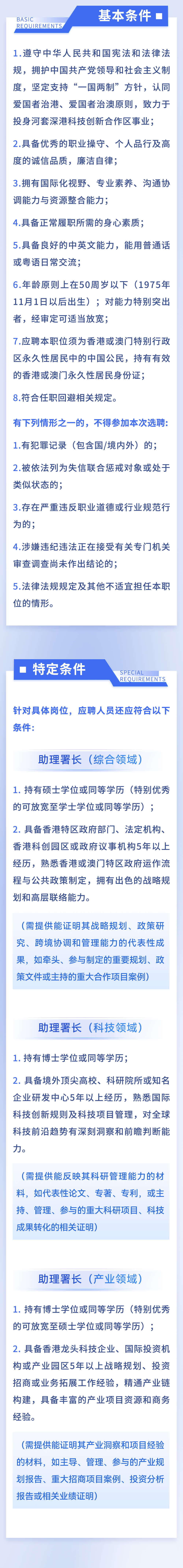 (香港文匯網(wǎng)記者 胡永愛)近日,河套深港科技創(chuàng)新合作區(qū)深圳園區(qū)發(fā)展署(以下簡稱「河套發(fā)展署」)發(fā)布招聘信息,公開選聘3名港澳籍高端人才,其中包括綜合領域的助理署長一名,科技領域的助理署長一名,產(chǎn)業(yè)領域的助理署長一名。