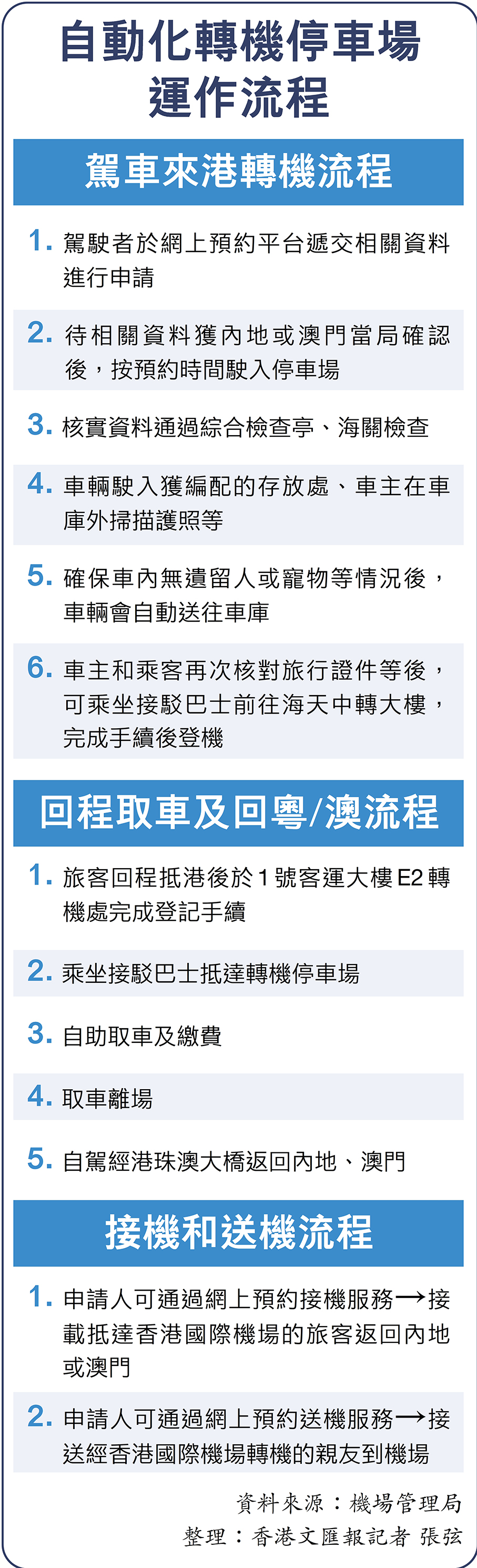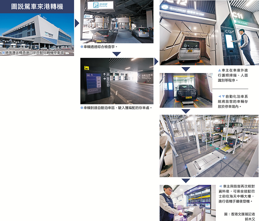 自動(dòng)化轉(zhuǎn)機(jī)停車場(chǎng)24小時(shí)全自動(dòng)化模式運(yùn)作。香港文匯報(bào)昨日直擊其運(yùn)作流程:車輛按預(yù)約時(shí)間抵達(dá)停車場(chǎng)後,先駛?cè)刖C合檢查亭以核實(shí)司機(jī)與所有隨行旅客資料,之後經(jīng)海關(guān)檢查後便可駛?cè)氆@編配的存車處,車輛自動(dòng)泊入車庫(kù),司機(jī)進(jìn)行護(hù)照掃描、人面識(shí)別等一系列程序後,再次核實(shí)資料,便可乘坐接駁巴士前往海天中轉(zhuǎn)大樓,完成相關(guān)手續(xù)後登機(jī)前往目的地。